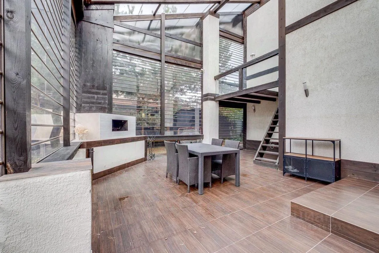 4 спальни, большая светлая гостиная с камином и вторым светом, с открываемой верандой с панорамным остеклением, стеклянным балкончиком и зоной барбекю (отдельная печь), большая кухня-столовая, баня, гараж на 2-3 машины.
